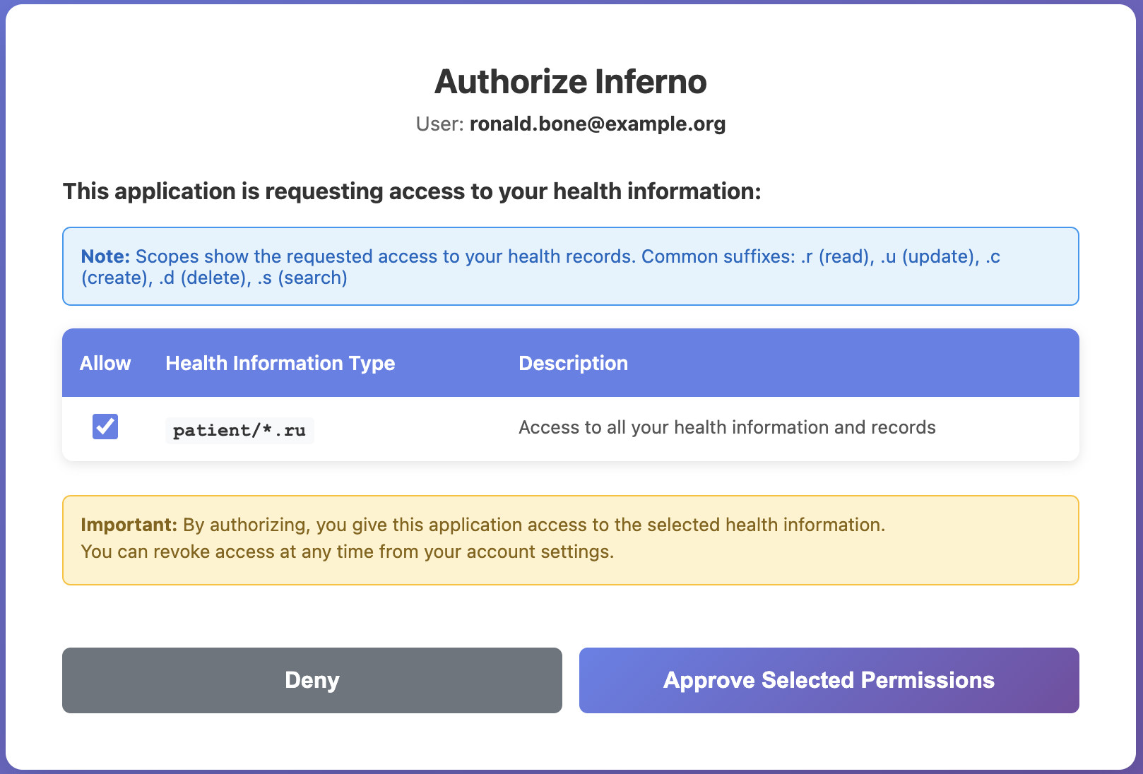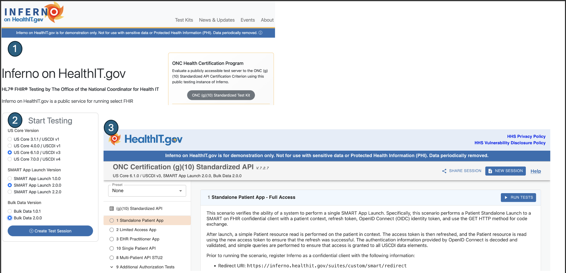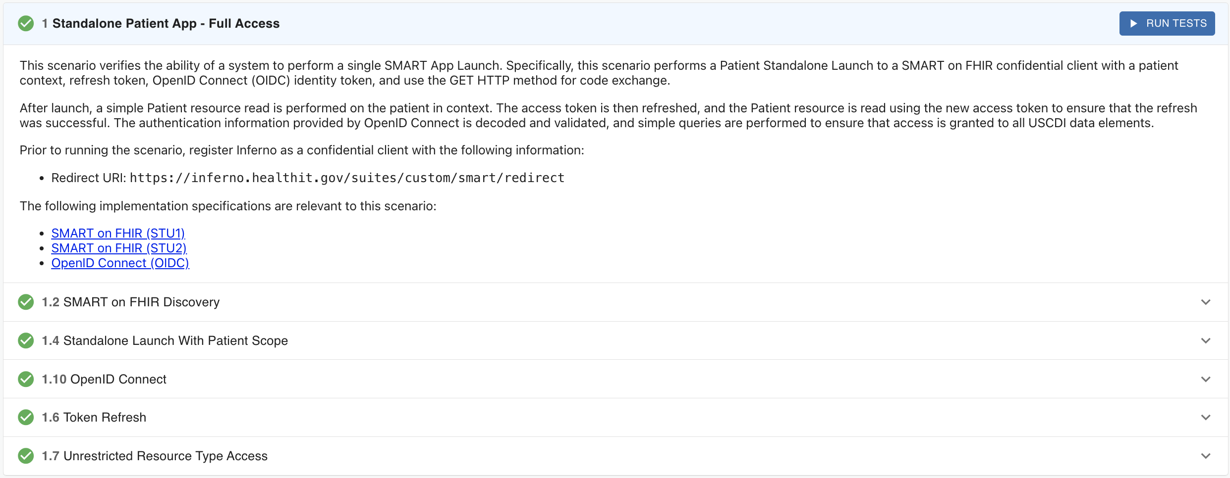 Inferno is a reference SMART on FHIR client used to validate conformance. In this guide, we focus on the Patient Standalone flow.
