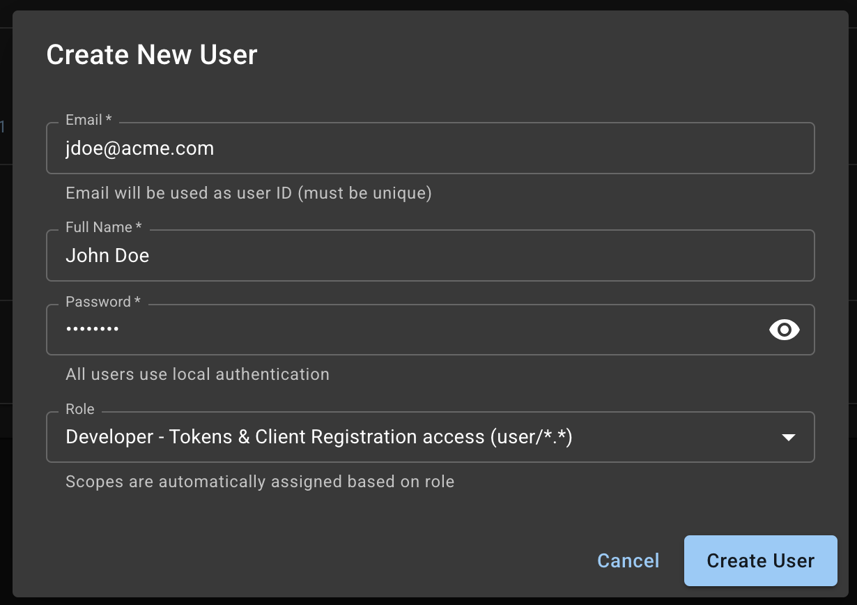 - Roles imply scopes; users do not choose scopes in the UI.