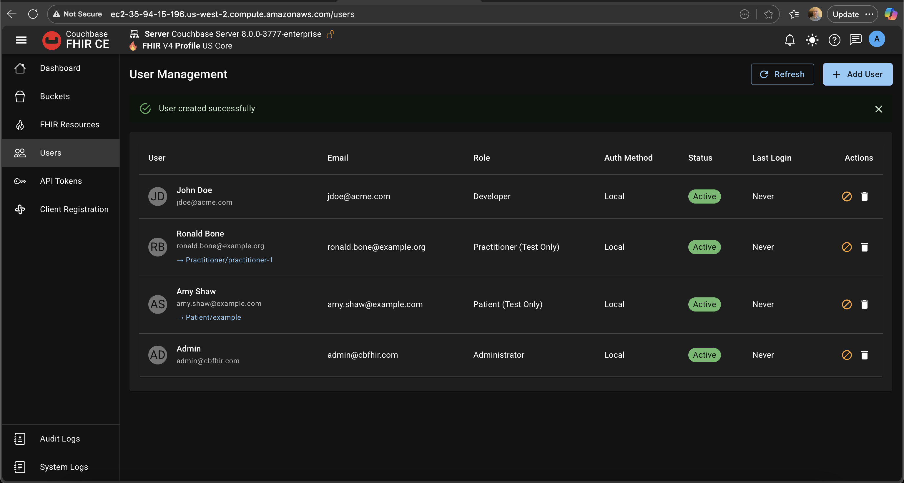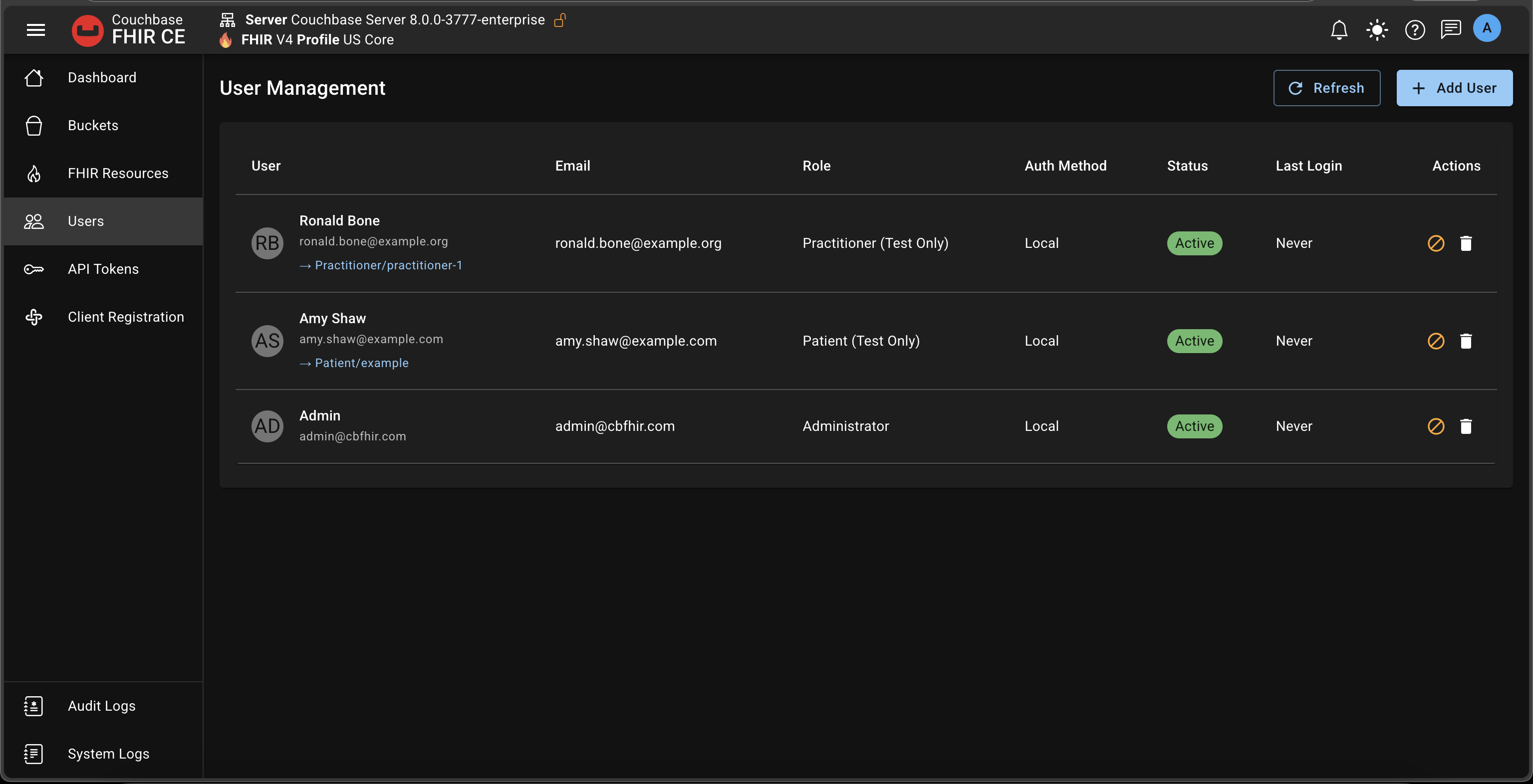 On first initialization, a single Admin user is created. If you load the US Core sample data, two additional test users are added (Patient and Practitioner). These cannot log into the Admin UI and exist only for SMART app testing.